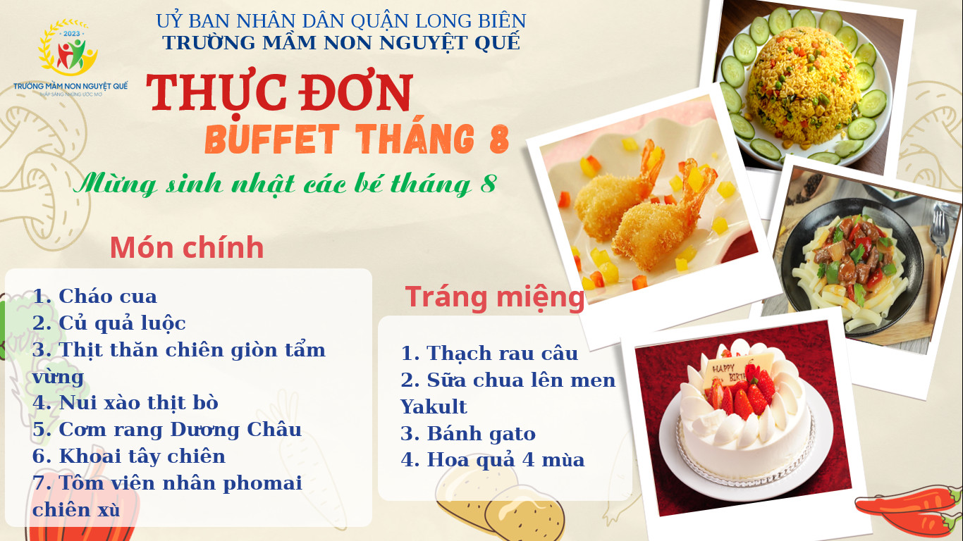 ✍️Xin gửi đến Quý phụ huynh cùng các con thực đơn Buffet tháng 8 được tổ chức vào thứ 4️⃣ ngày 2️⃣3️⃣/8️⃣/2️⃣0️⃣2️⃣3️⃣