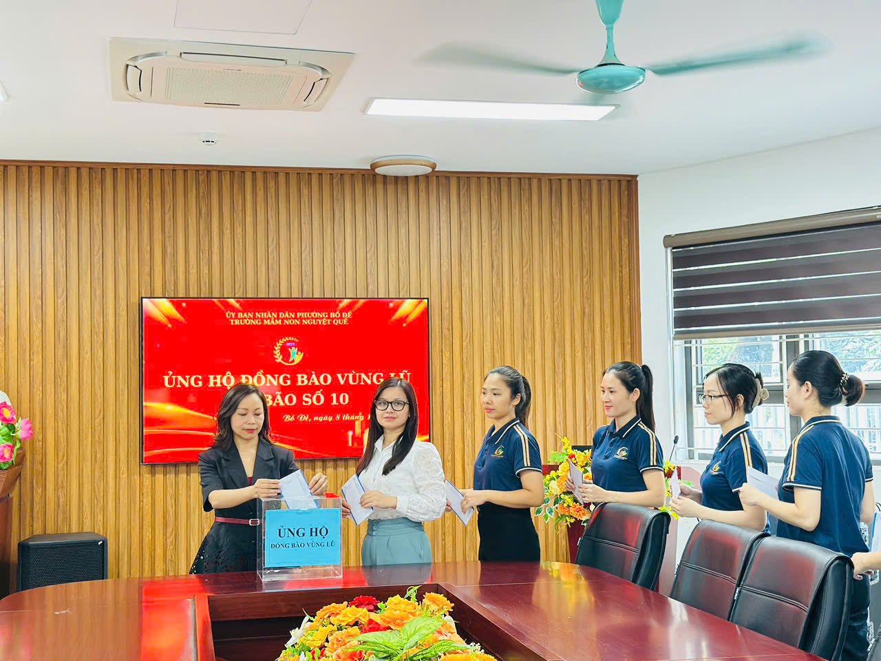Hưởng ứng Lời kêu gọi của Ủy ban Mặt trận Tổ quốc Việt Nam phường Bồ Đề về việc ủng hộ đồng bào bị ảnh hưởng bởi thiên tai, bão lũ, tập thể cán bộ, giáo viên, nhân viên trường Mầm non Nguyệt Quế đã tích cực tham gia đóng góp, thể hiện tinh thần “tương thân tương ái”, “lá lành đùm lá rách”.