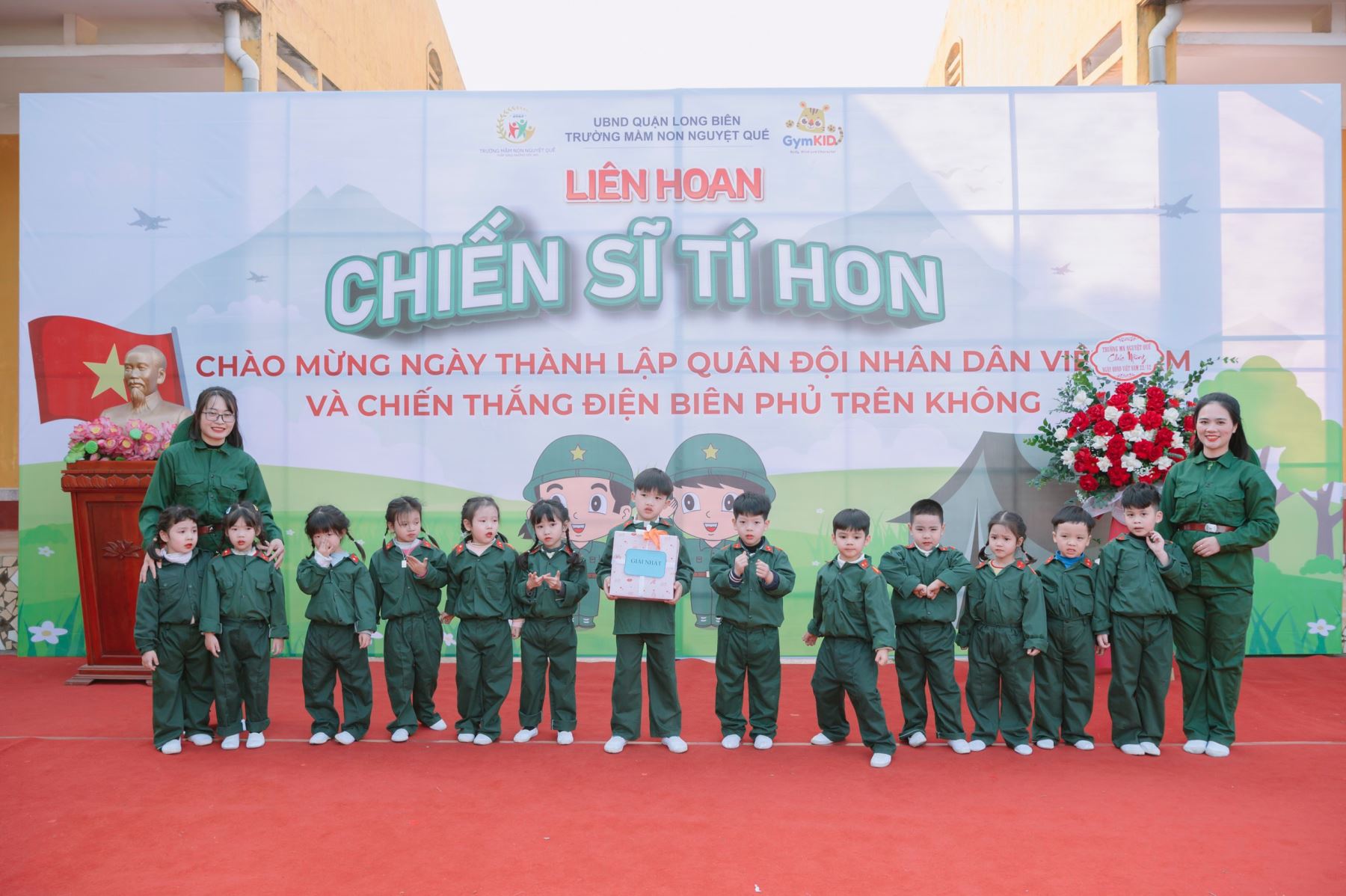 Ngày 20/12/2023, trường MN Nguyệt Quế đã tổ chức chương trình " Chiến sĩ tí hon " kết hợp với đại đội 74. Với nhiều hoạt động bổ ích, thiết thực, các con đã được tham gia biểu diễn hoạt cảnh " Hò kéo pháo ", các trò chơi vận động của trung tâm Gymkid, được tham quan môi trường của các chú bồ đội, tham quan và thu hoạch rau, cắm trại, liên hoan cùng với bố mẹ. Bé nào cũng rất thích thú trong hoạt động ngàu hôm nay. Sau đây là một số hình ảnh: