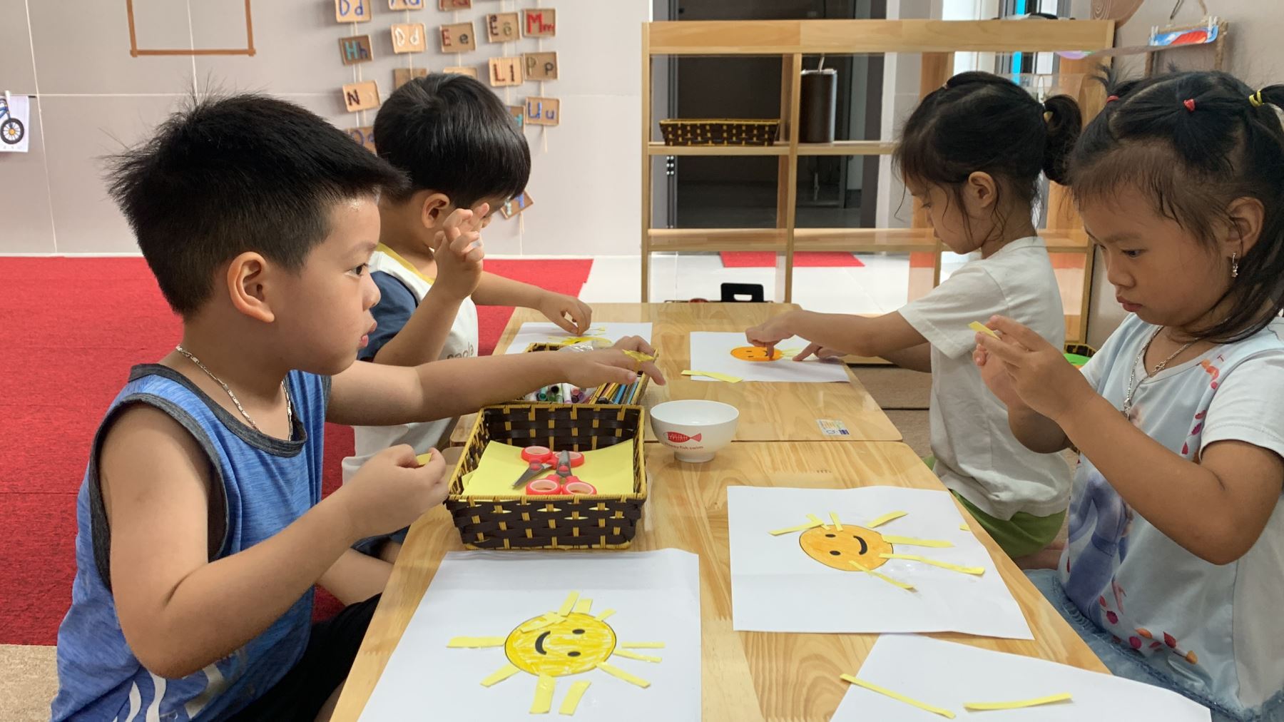 Việc rèn luyện sự kiên trì, tính tỉ mỉ, cẩn thận, khéo léo là rất cần thiết với trẻ nhỏ. trong giờ tạo hình cắt dán tia nắng, các bé lớp A1 đã được rèn cách cầm kéo đúng cách, cắt các tia nắng để dán. Với việc rèn luyện này, các bé sẽ phát triển vận động tinh, đôi tay sẽ linh hoạt hơn đấy!