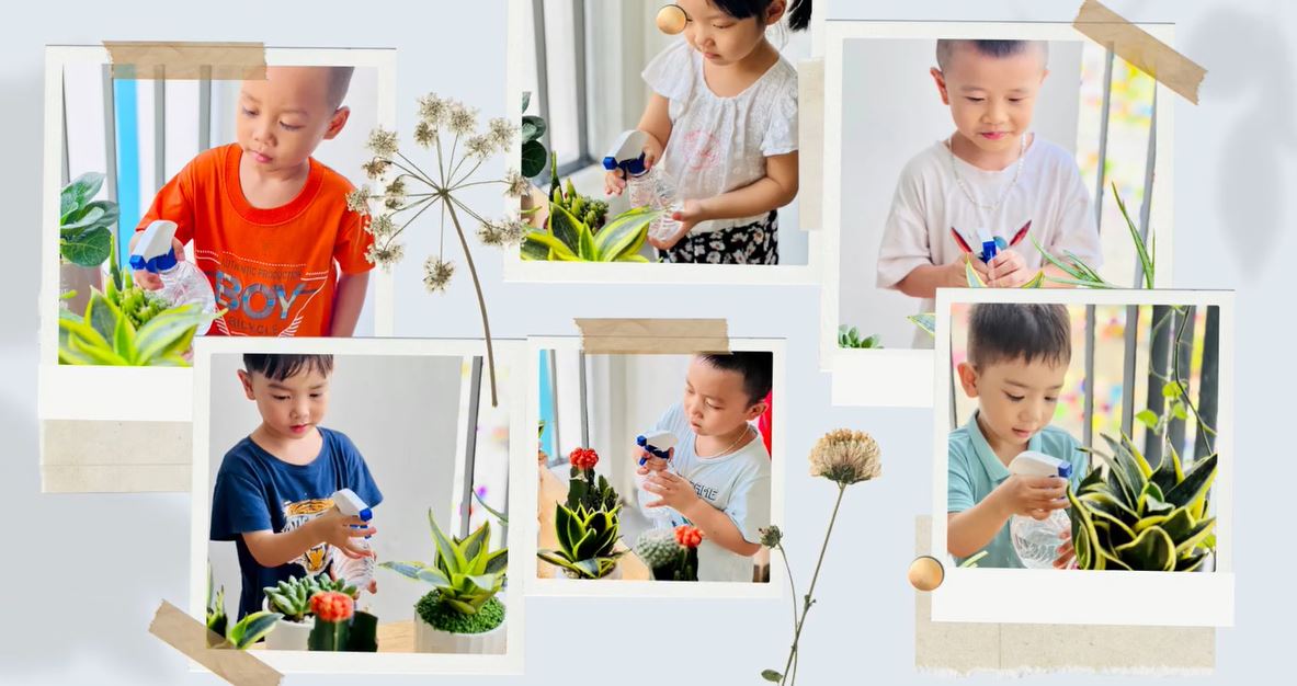 Hàng ngày các con cùng nhau chăm sóc nâng niu từng loại cây của mình rồi chăm cây của bạn.