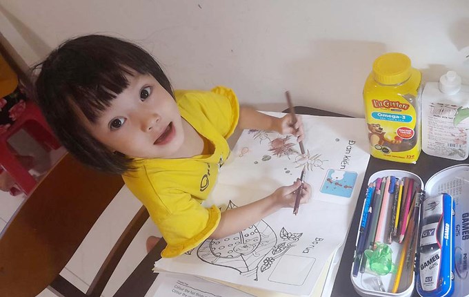 Hồi còn học mẫu giáo trước khi có dịch Covid-19, bé Soda kể: "Hôm nay học vẽ con tô mái nhà màu đỏ". Người cha rủ con ra ban công và chỉ ra phía xa: "Con thấy mái nhà kia màu xám không? Có mái nhà màu xanh dương luôn, đẹp ghê. Ba thích cái nhà kia có mái màu xanh rêu kìa Soda. À, nhà này mái màu đỏ giống hình con tô màu nè..."