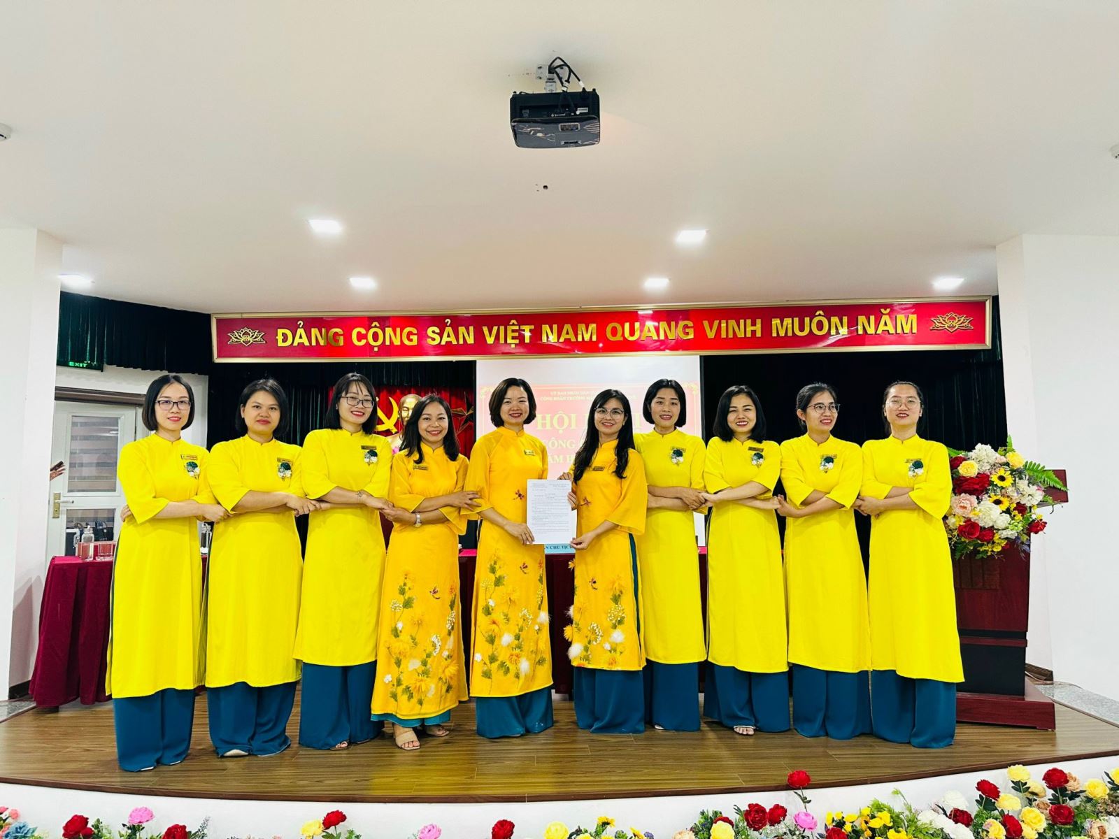 Tiếp nối chương trình Đại hội, Đồng chí Hồ Thị Tuyến – Bí thư chi bộ, hiệu trưởng nhà trường và đồng chí Nguyễn Thu Hương – Chủ tịch công đoàn, phó hiệu trường nhà trường đã tiến hành ký giao ước thi đua năm học 2023 – 2024 trước sự chứng kiến của các đồng chí đại diện các đoàn thể trong nhà trường.