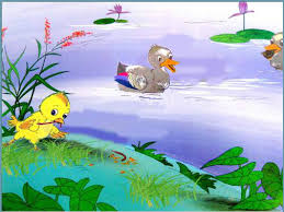 Bỗng …. có 1 con cáo mắt xanh, đuôi dài thấy gà con đang kiếm ăn một mình định nhảy ra vồ. Sợ quá gà con liền ba chân bốn cẳng vừa chạy vừa kêu chiếp .. chiếp .. cứu tôi với . Vịt con đang lặn ngụp dưới ao sâu nghe tiếng bạn gọi liền lướt nhanh vào bờ và cõng bạn ra giữa ao sâu. Thế là gà con thoát chết , từ đó về sau 2 bạn gà - vịt càng yêu mến nhau.